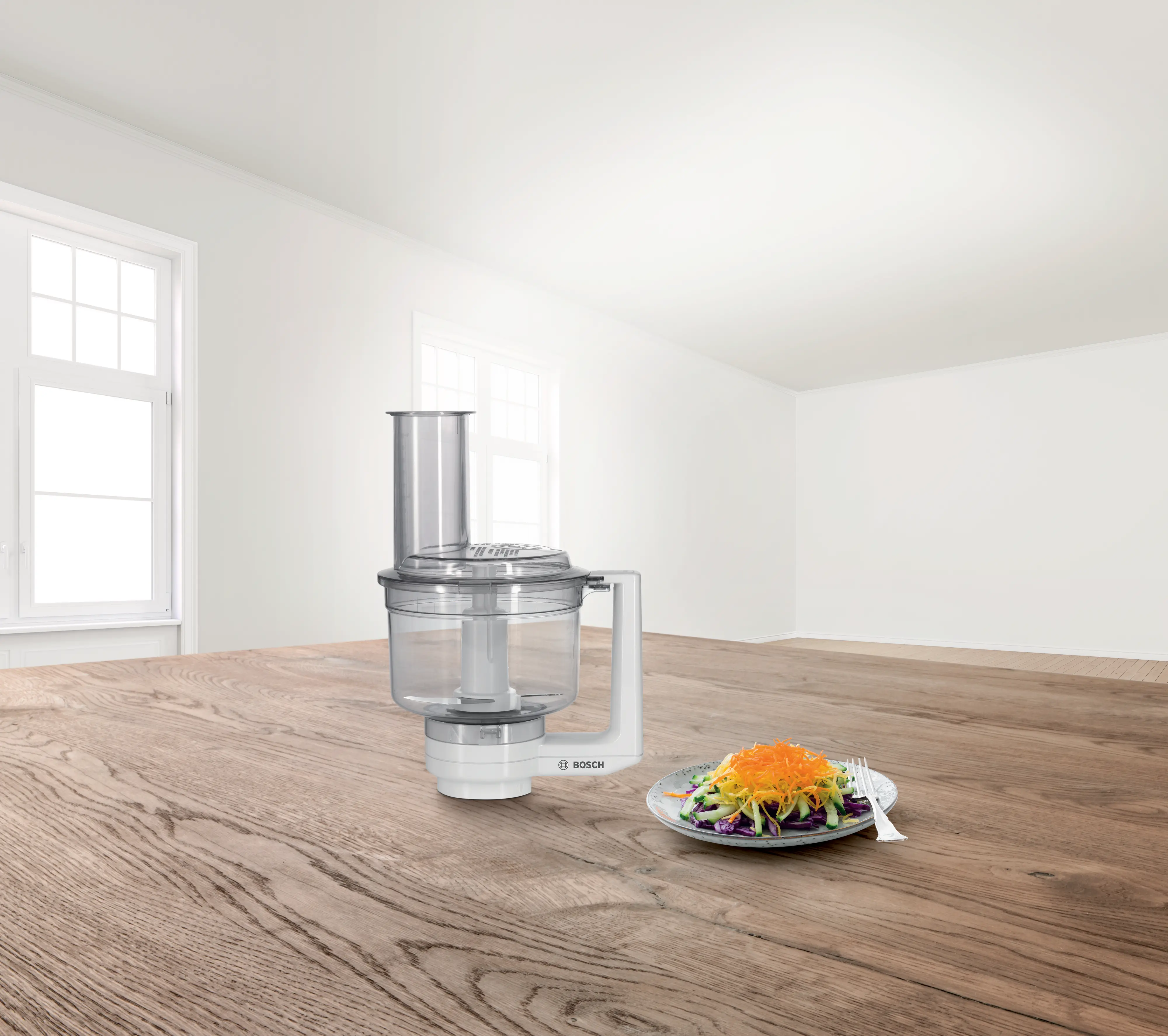 Nož, nosilac za ploče, ploča za rezanje (tanko i debelo), ploča za struganje (grubo i fino), ploča za ribanje (srednje deblo)